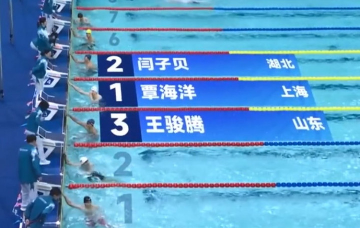 男子200米蛙泳预赛第5组比赛,覃海洋获得小组第一,闫子贝第二,两人均顺利晋级。
