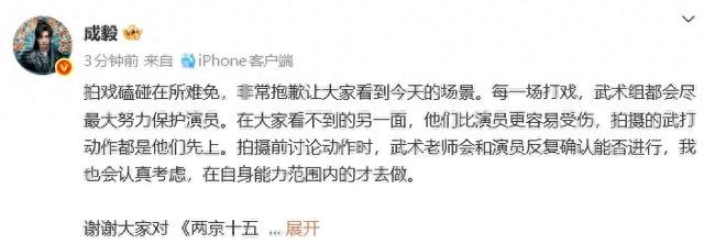 11月27日晚,演员成毅发文报平安:“拍戏磕碰在所难免,非常抱歉让大家看到今天的场景。每一场打戏,武术组都会尽最大努力保护演员。在大家看不到的另一面,他们比演员更容易受伤,拍摄的武打动作都是他们先上。拍摄前讨论动作时,武术老师会和演员反复确认能否进行,我也会认真考虑,在自身能力范围内的才去做。”