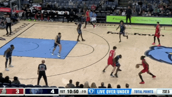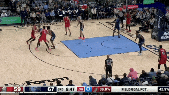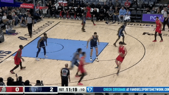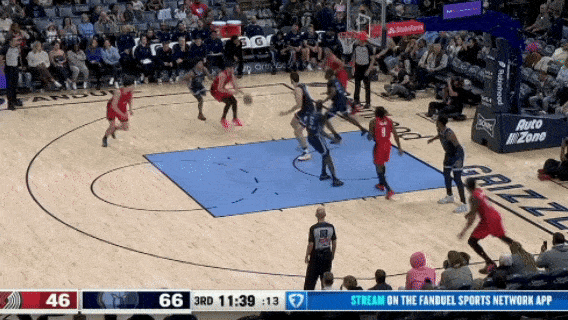 杨瀚森弧顶接球,瞄了一下篮,骗了文斯-威廉姆斯,运球后再瞄一下框,分给了卡马拉,后者扣篮得分。