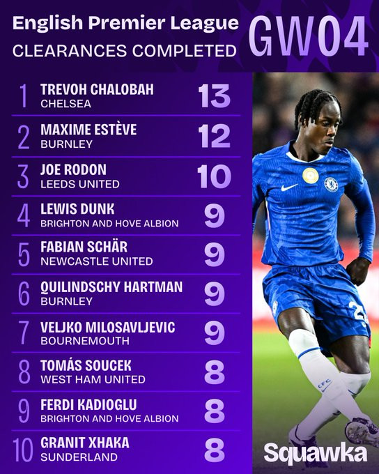 虎扑09月15日讯Squawka数据统计,英超第4轮解围榜,查洛巴13次排名第一,伯恩利中卫埃斯特维12次位居次席。