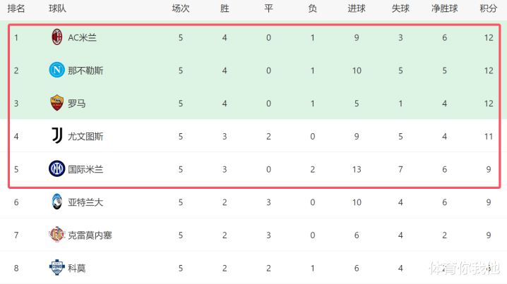 值得一提的是,除了AC米兰和那不勒斯分别拿到12分之外,罗马也以4胜1负排名第3。在接替拉涅利之后,加斯佩里尼没有让罗马球迷失望,他把球队带到了超出球队整体水平的高度。此外尤文以11分排名第四,在他们身后,是9分的国米。从目前来看,本赛季这5支球队无疑都是争冠热门。不出意外的话,冠军将会从他们当中产生。虽然国米如今只排名第5,不过他们只落后榜首的同城死敌3分,再加上国米也找回了状态,接下来鹿死谁手,还真不好说!