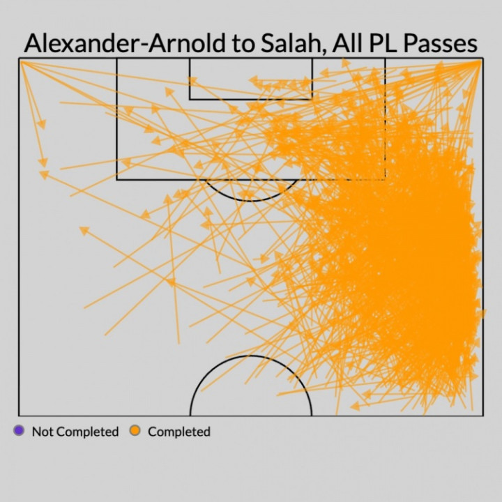 特伦特在24/25赛季与萨拉赫传球连线的分布图