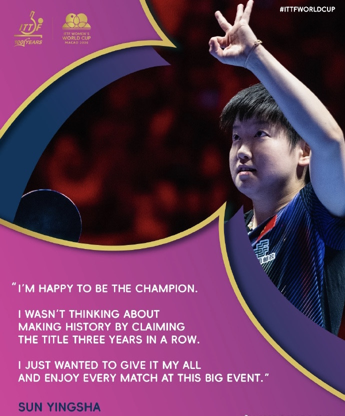 孙颖莎:“能成为冠军,我非常开心。我并没有刻意去想,要以三连冠的成就创造历史。我只是想在这项顶级赛事中,全力以赴,享受每一场比赛。”